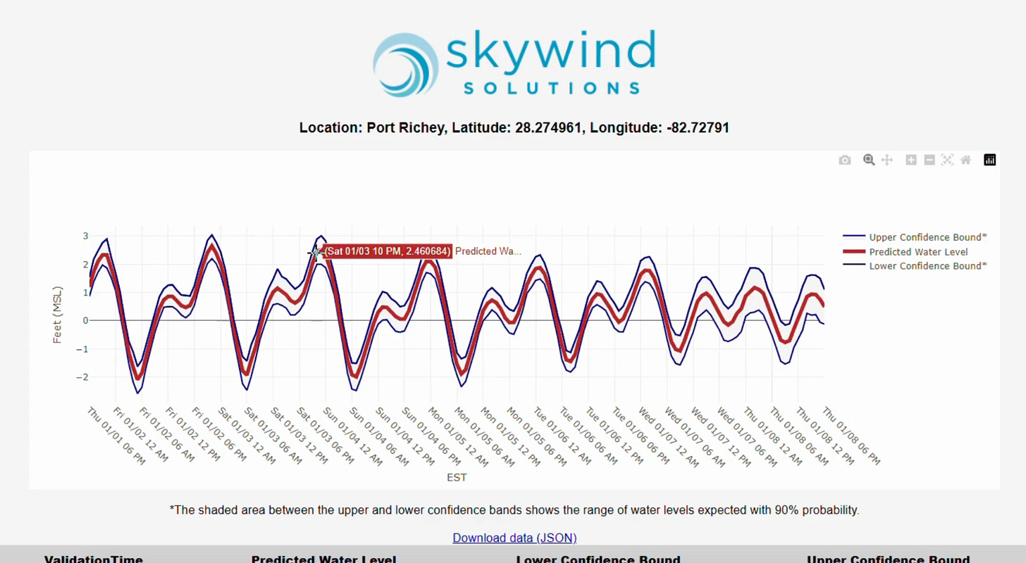 SkyWind's platform delivers tide predictions customized to a specific location rather than the nearest gauge, using AI models that continuously learn and self-correct over time. Forecasts come with probability ranges that show the spread of likely outcomes, giving operators like ports and offshore construction firms clearer context for decision-making. The company recently received funding from The Continuum Ocean Enterprise Accelerator, backed by NOAA, which it will use to support five to eight pilot forecasting deployments.