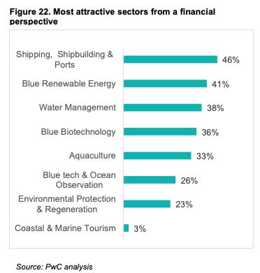Shipping, shipbuilding, and ports ranked as the most financially attractive sectors among investors surveyed, followed by blue renewable energy, water management, and blue biotechnology. The report notes that later-stage funding remains limited, which can make it harder for companies to scale, and that the blue economy remains underfunded relative to its potential despite the growing momentum.