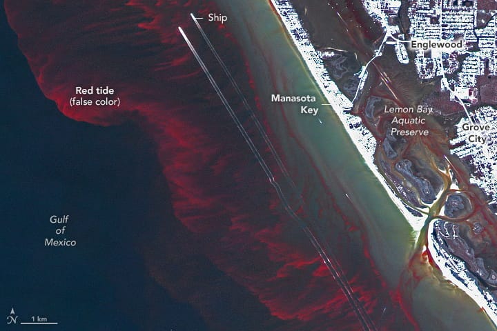Red tide captured by NASA Earth Observatory (data courtesy of Planet Labs PBC).